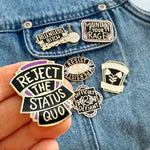 The 6 pins in this collection all feature messages to remind you to question everything, remain relentless and be difficult and defiant.