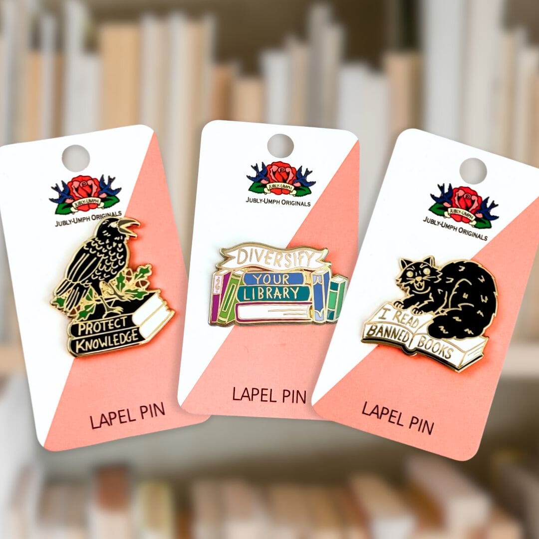 Pin with a cat design and 'I Read Banned Books' text held over an open book.