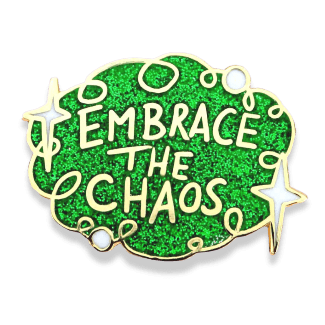A hard enamel lapel pin being held in the hand on a yellow backround. The pin is green glitter with white stars and reads Embrace the Chaos.