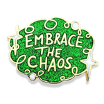 A hard enamel lapel pin on a purple background. The pin is green glitter with white stars and reads Embrace the Chaos.