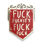 A hard enamel pin on a Jubly-Umph backing card. The pin is in the shape of a red shield and reads Fuck Fuckity Fuck Fuck.