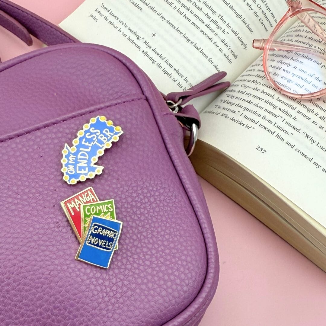 There are 8 enamel pins to mix, match, and flaunt your reading personality: