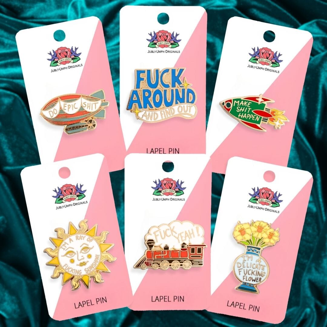 This set includes Make Shit Happen, Do epic Shit, Fuck Around and Find Out, I'm A Fucking Ray Of Sunshine, I'm A Delicate Fucking Flower and Fuck Yeah lapel pins.